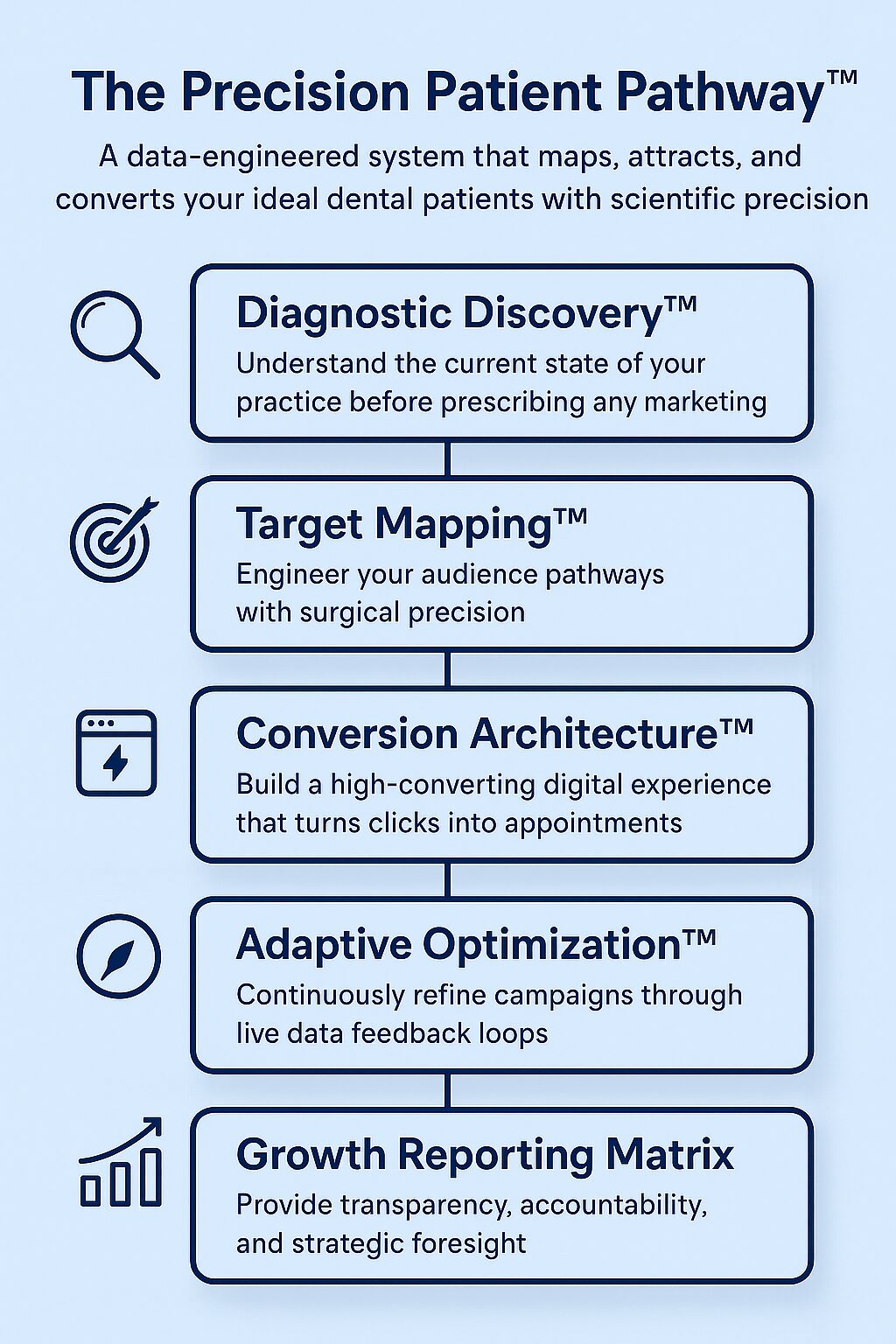 The Precision Patient Pathway™ is Dentist Marketing Media’s flagship ad campaign framework designed specifically for dental practices that want to grow with confidence. Whether you offer general dentistry, implants, orthodontics, cosmetic services, sedation dentistry, or emergency care — this system brings the right patient to your door at the right time.